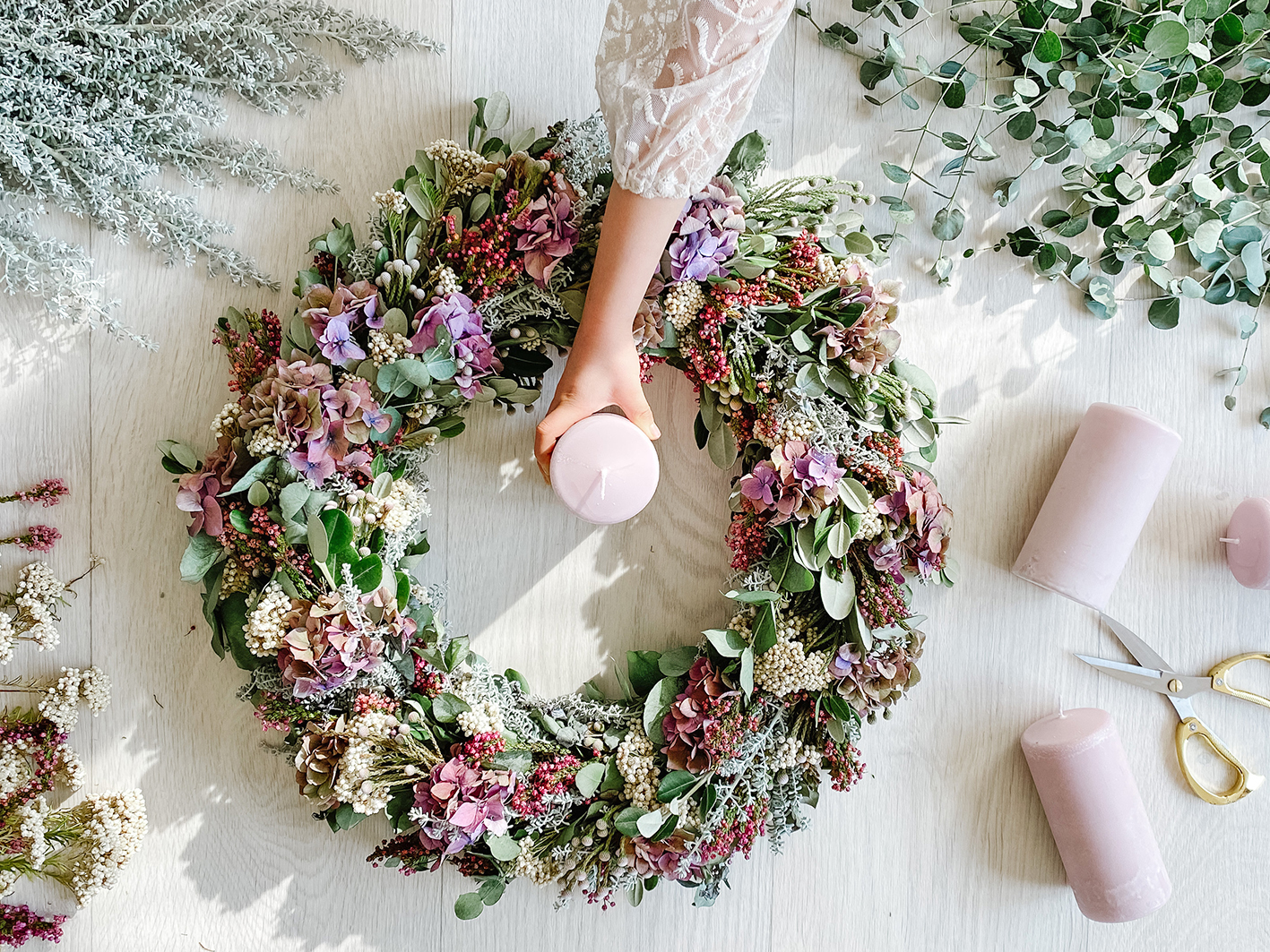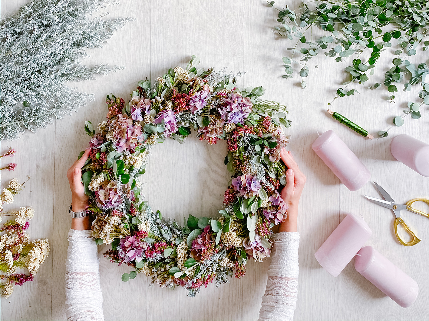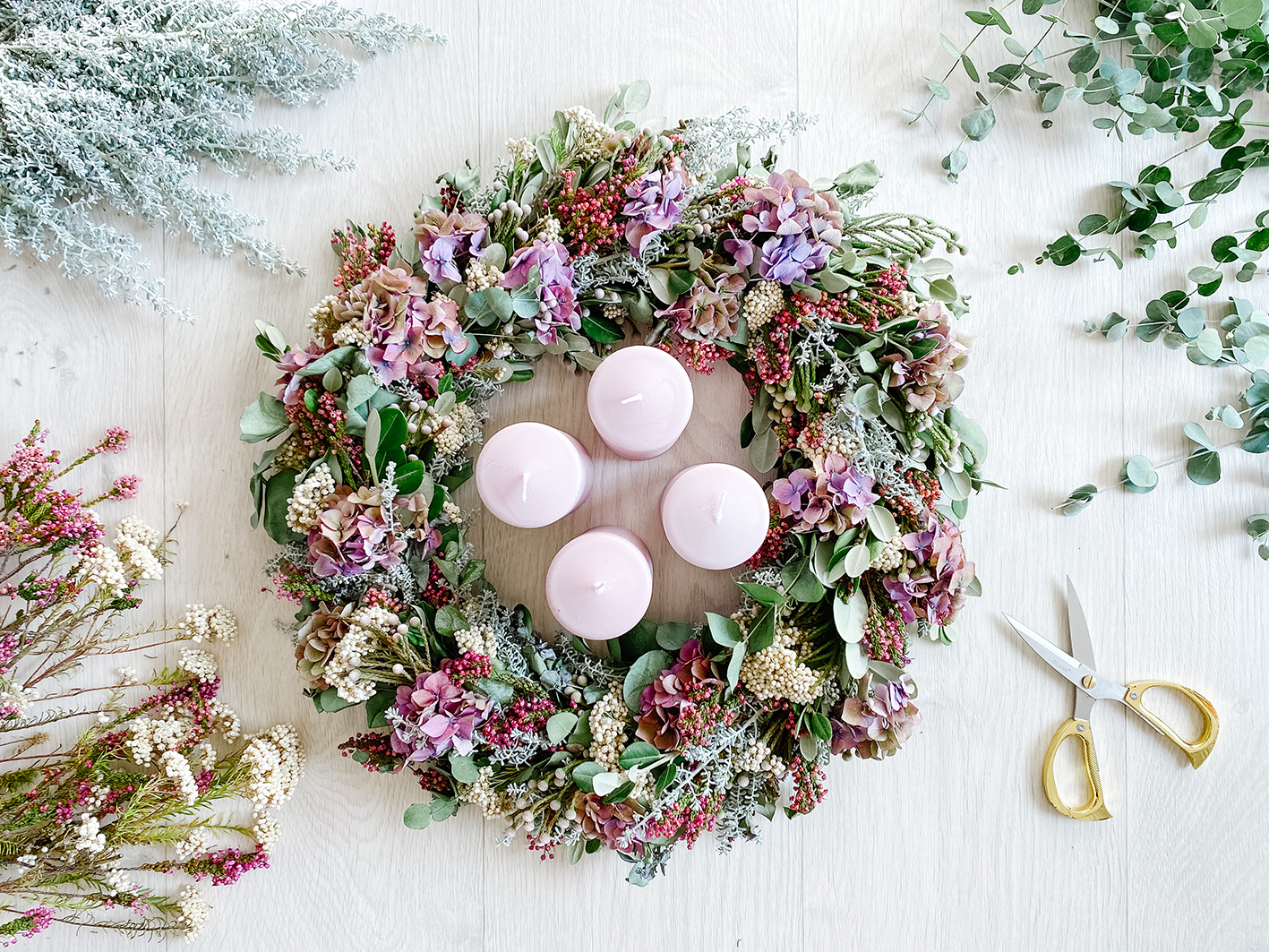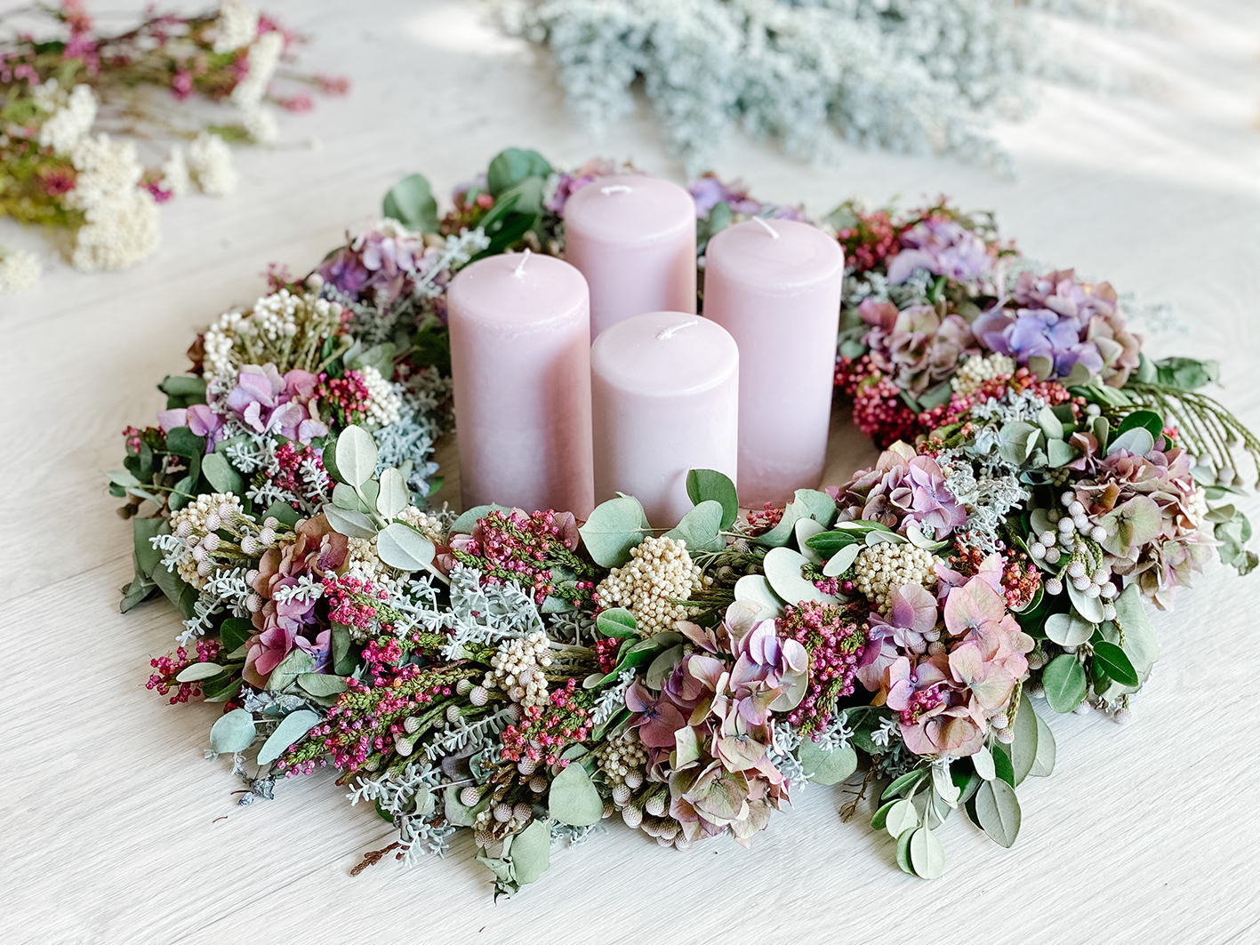Ich habe versucht die Farben in einer Farbfamilie zuhalten. Ich wollte es dieses Jahr in den Farben Altrosa/ Weinrot, Weiß und in einem nicht zu kräftigen Grün halten. Übrigens habe ich folgende Zweige und Blumen verwendet: Weiße Brunia Albiflora (auch Kaffebusch genannt), Gartenhortensie in einem leicht weinroten Ton, Äste vom Neuseeländischen Weihnachtsbaum (ohne Blüten), Mostgummi-Eukalyptus, Graues Heiligenkraut, weiße Pseudognaphalium Californicum (Unterart von Scheinruhrkräuter) und weinrot-lila farbene Bienenheide.