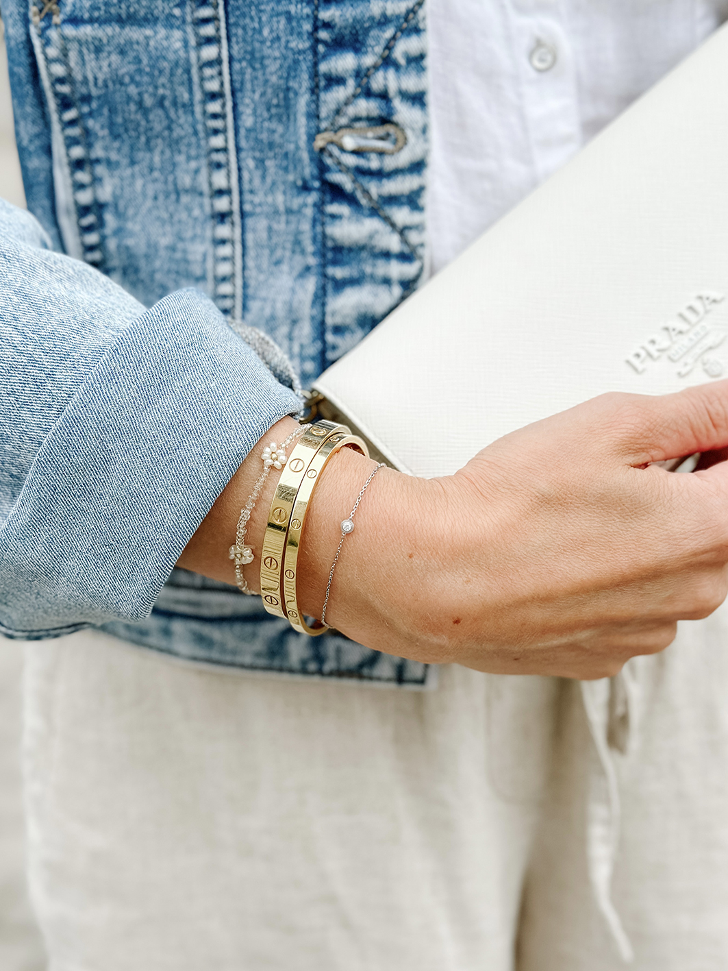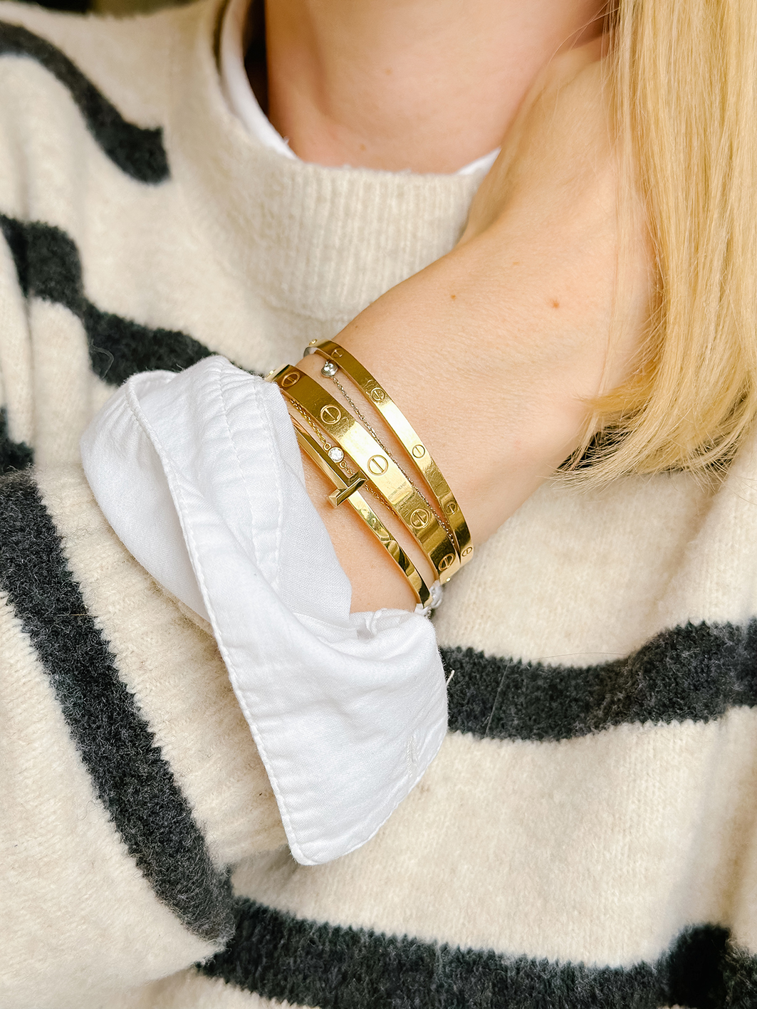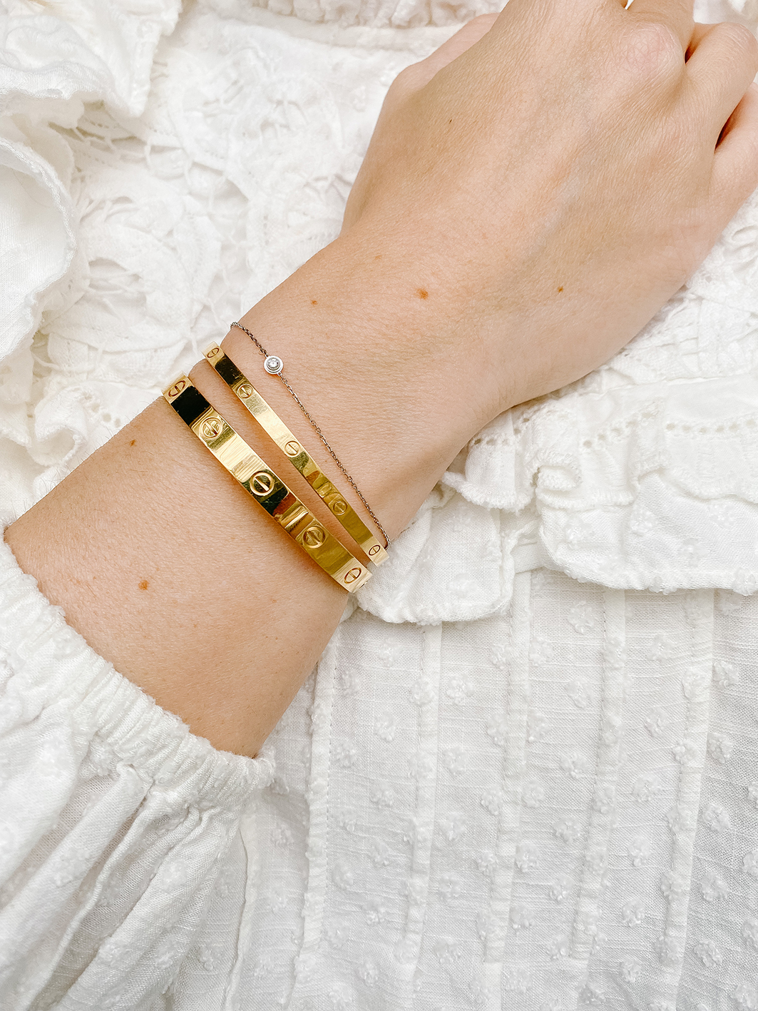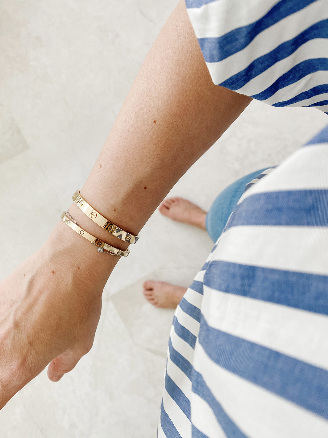 Es gibt verschiedene Möglichkeiten den Cartier Love Armreif zu tragen. In Asien sieht man den Armreif in der klassischen Breite oft alleine am Handgelenk getragen. In Amerika wird er eher mit vielen anderen Armreifen und Armbändern kombiniert, gerne auch als messy Stack. Anine Bing trägt, wie ich finde, oft die schönsten Kombinationen. Ich trage meinen Armreifen aktuell zusammen mit meinem Love Armreif SM (dünne Variante), einem Tiffany T1 Armreif, einem custom made Diamant Armkettchen und einem Cartier d´amour Armkettchen (Größe XS). Alle meine Armreifen sind Gelbgold, bis auf die d´amour Armkette. Schön sehen dazu auch geknüpfte Freundschaftsarmbänder aus, das kreiert einen tollen Sommer/ Ibiza Style am Arm.