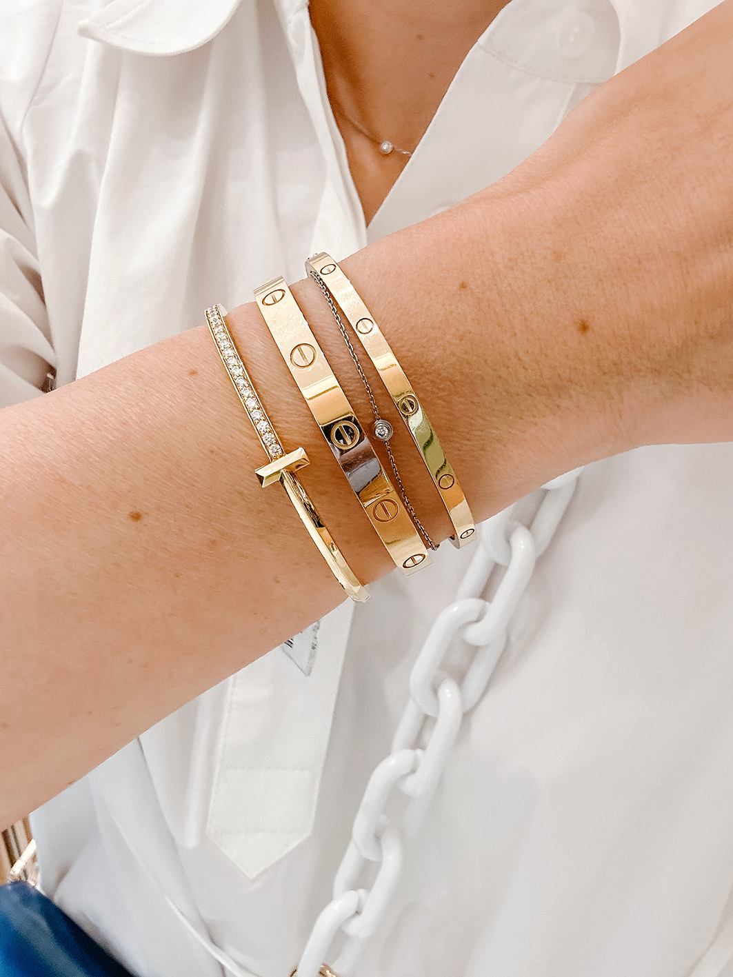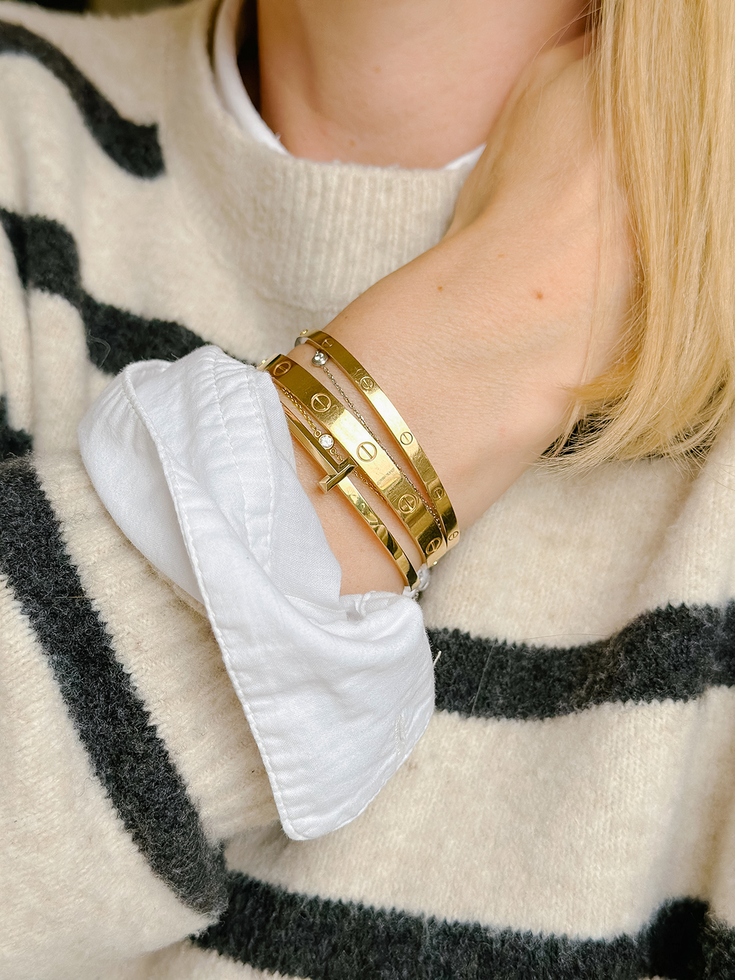 Es ist tatsächlich wahr, was man sagt: Fängst du mit einem Cartier Love Armreifen an, kannst du nicht mehr aufhören und möchtest einen neuen Armreifen nach dem anderen dazu. Eigentlich hatte ich mir immer gesagt, 3 Armreifen in einem Stack sind perfekt. Nun, so sitze ich hier und trage 4 an einem Arm (ok, plus 2 Armkettchen) und liebe den Look. Und tatsächlich liebäugele ich schon wieder mit dem einen oder anderen Modell. Aber vorerst wird es bei meinen vieren bleiben. Da es aber so viele andere wundervolle Modelle gibt, möchte ich euch noch andere Cartier Love & Tiffany T1 Armreif Stack Ideen zeigen.