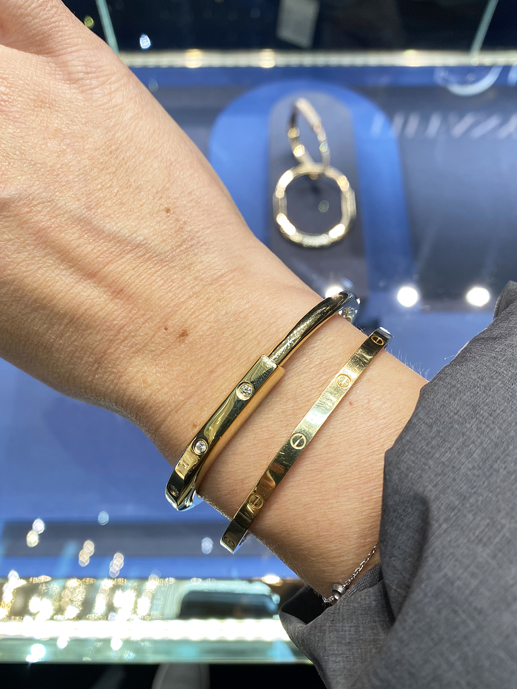 Zum darauf folgendem Jubiläum hatte ich mich total in den Tiffany T1 Armreifen verliebt. Bei den Tiffany Armreifen sind die Größenangaben etwas anders als bei Cartier. Dort geht es nach Small, Meldium, Large, und Extralarge. Ich habe alle Größen hin- und herprobiert. Large konnte ich sehr schnell auschließen, da er viel zu groß war. Small hätte an mein Handgelenk gepasst, aber im Vergleich zu meinem Love Bracelet passte die Größe Medium dann doch am Besten. Übrigens auch wunderschön in der half Pave Variante.