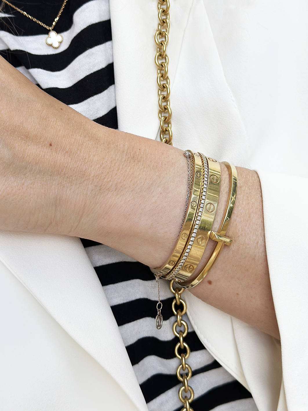 Meine Fine Jewelry Armreifen trage ich tatsächlich fast 24/7. Allerdings kombiniere ich auch mal andere günstigere Marken dazu, so wie z.B. von Tory Burch oder Mango.