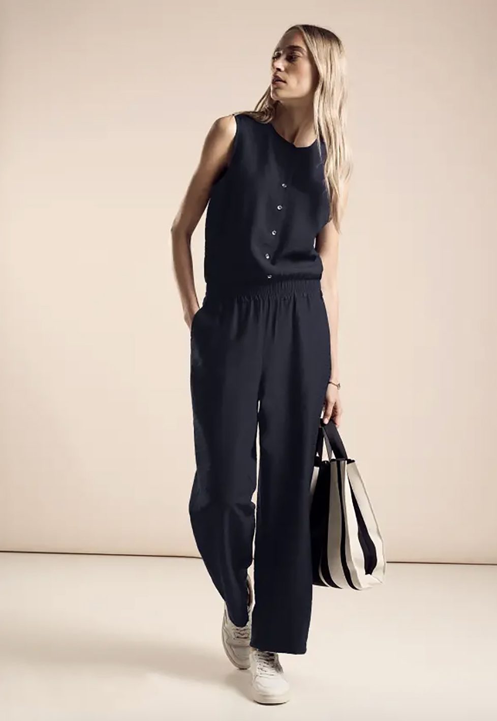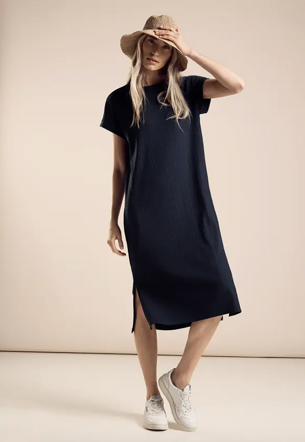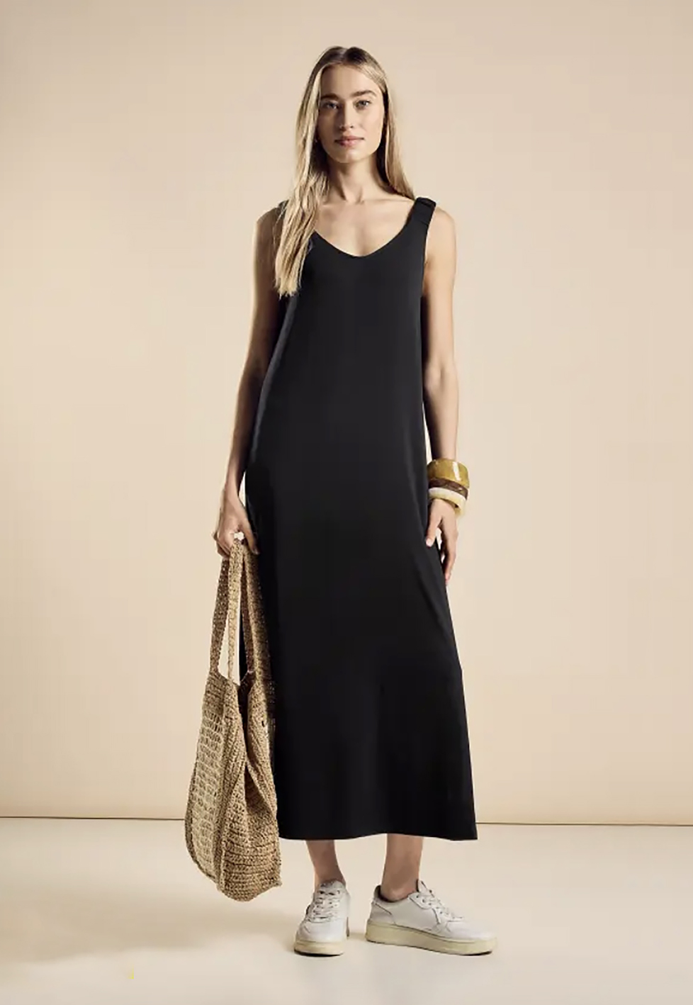 Meine All Time Favorites für Sommer Looks sind Einteiler, wie Jumpsuits oder Kleider in Schwarz oder Dunkelblau. Der ärmellose Jumpsuit in tiefem Dunkelblau (auch in Schwarz erhältlich) lässt sich tagsüber sportlich mit flachen Schuhen und Abends mit einem Paar High Heels tragen. Ebenso einfach zu stylen sind das schwarze Jersey-Kleid ohne Ärmel sind das gerippte Jersey-Kleid in der Farbe Deep Blue. Einfach ein paar weißer Sneakers oder sommerliche Wedge-Sandalen dazu und ihr habt einen ganz wandelbaren Look.