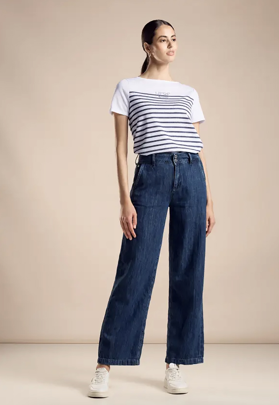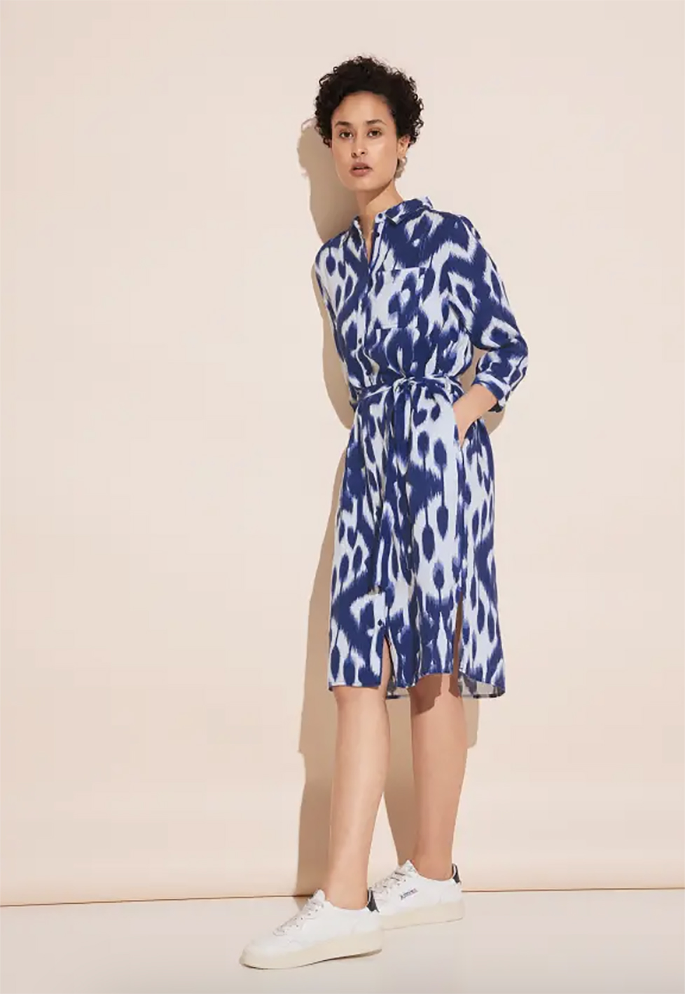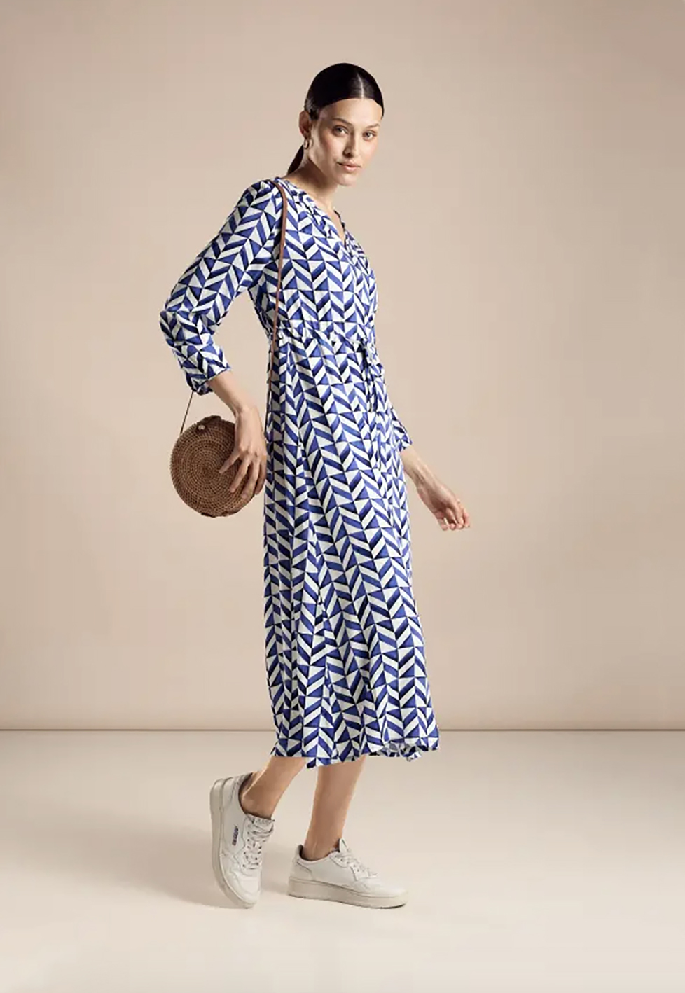 Die Farben Kombination Blau mit Weiß bei T-Shirts und Kleidern sind für mich die typischen Sommerfarben und erinnern mich an Südfrankreich, Strand und Meer. Ein geringeltes T-Shirt darf da natürlich nicht fehlen, perfekt zur Wide Leg Jeans in Dunkelblau. Entweder zur Jeans, Wedges oder flachen Sandalen, einfach eine perfekte Kombi. Das gemusterte Leinenkleid erinnert etwas an ein Aztekenmuster und ruft förmlich nach Urlaub. Ein weiterer toller Hingucker für den Sommer ist das Maxikleid mit 3/4 Armen. Das perfekte Kleid für tagsüber aber auch für einen Drink an der schicken Strandbar.