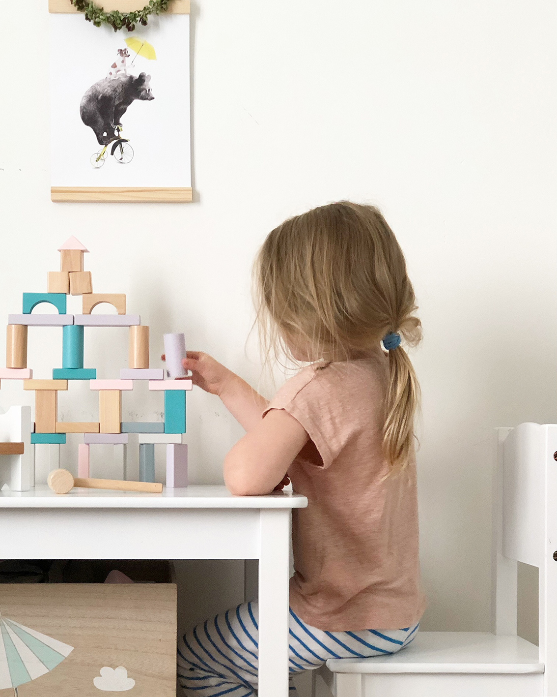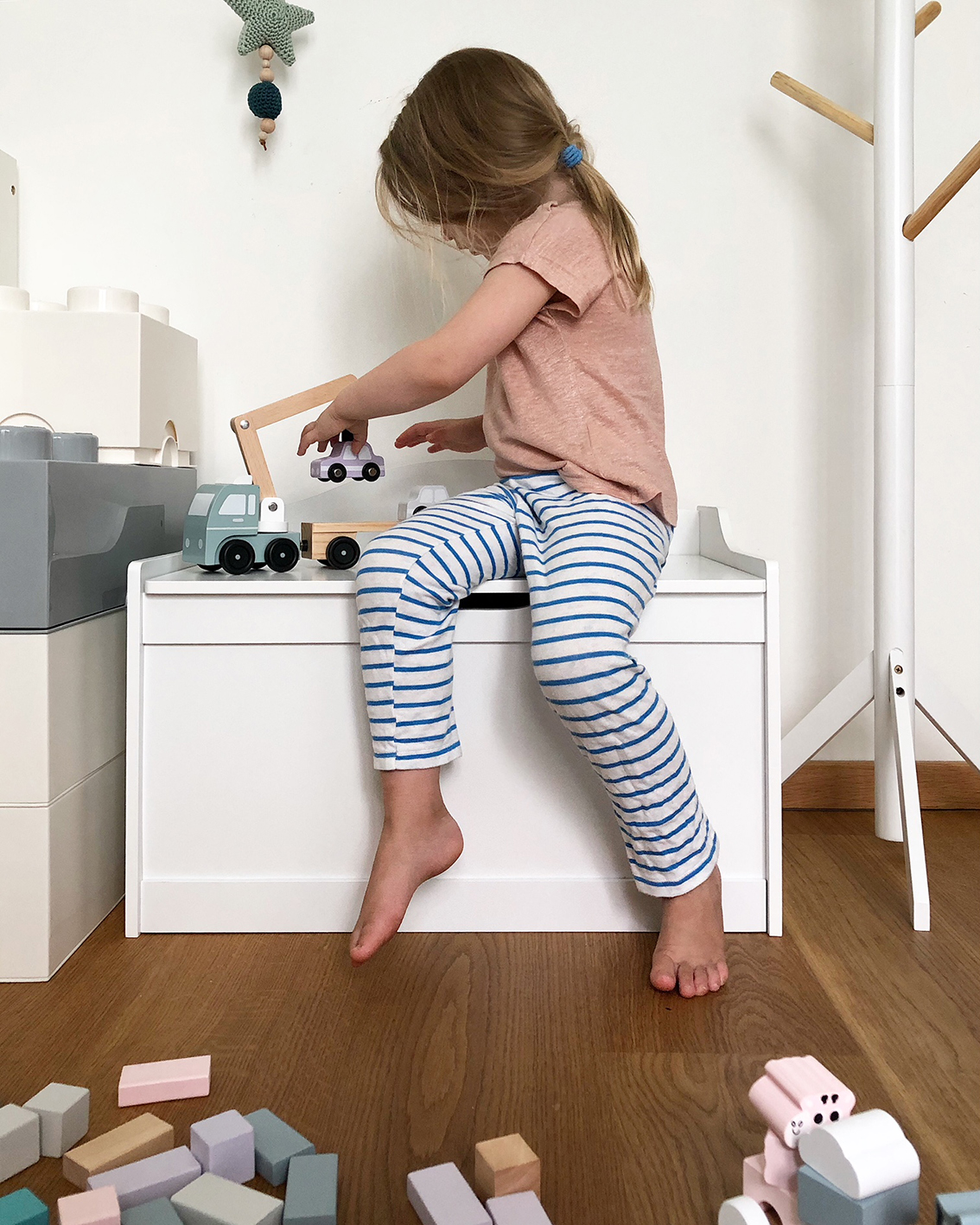 With the make-over of the room I also decided to get rid of some toys they didn´t play with anyway. I replaced them with some lovely wooden ones. The old ones went to my parent´s place for now. I will sell them at some point at a flee market and make some other children happy. For my daughter we got a white pram for her doll. She can then drive her around as I do with our little boy, she loves it. On top she also got a bed where the doll can sleep in. So she doesn´t have to share her bed anymore. Pram and bed for dolls are also from Woodlii. For our little boy we got some the train, the truck, the table with the hammer and the Blauklötze from Hobie & Bear. Aren´t they really pretty?