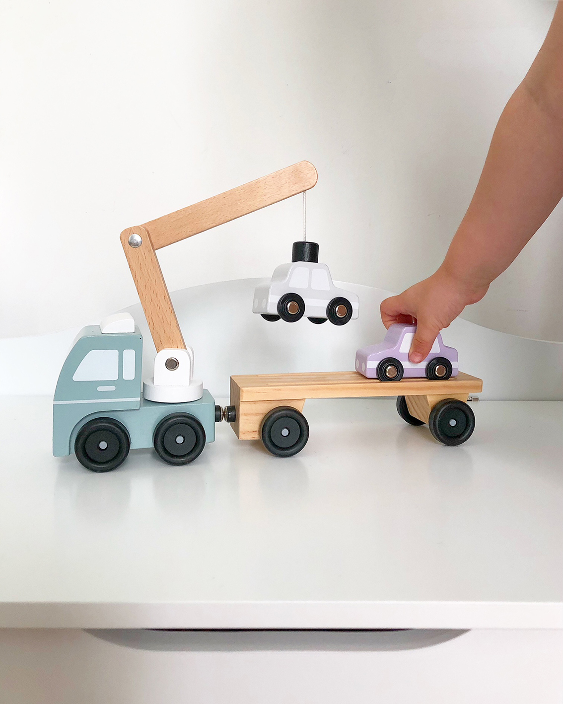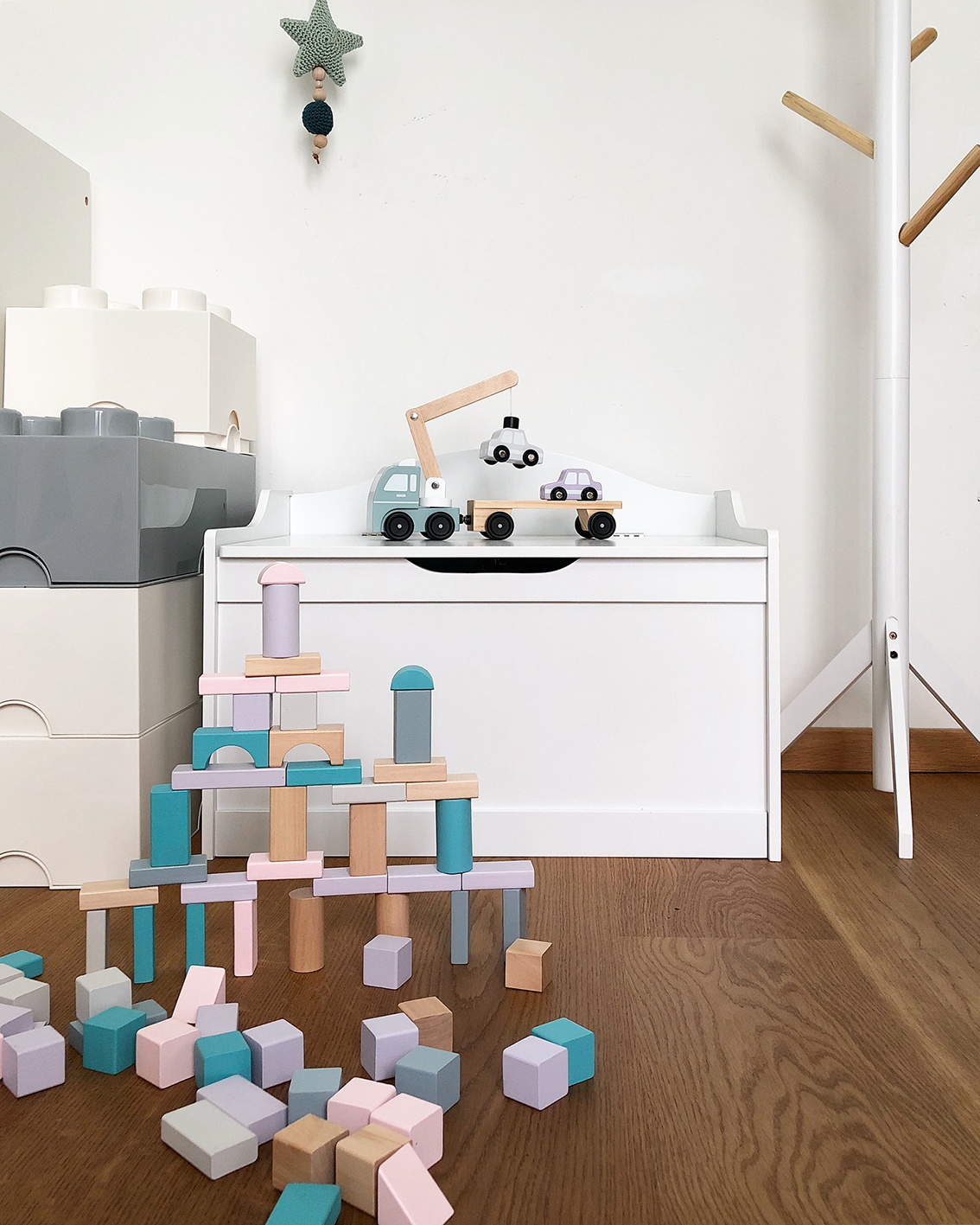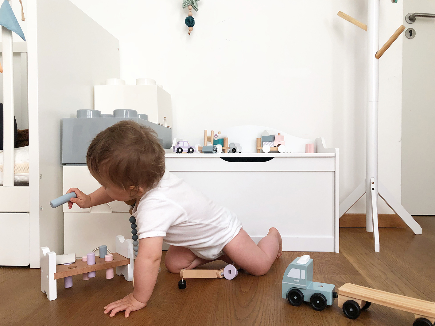Mit der Überarbeitung des Raumes habe ich mich auch dazu entschieden, einige Spielsachen loszuwerden, mit denen sowieso nicht gespielt wurde. Diese habe ich dann durch Holzspielzeug ersetzt. Die alten Sachen gingen vorerst mal zu meinen Eltern. Ich werde sie irgendwann mal auf einem Flohmarkt verkaufen und ein paar andere Kinder damit glücklich machen. Für meine Tochter haben wir zusätzlich einen weißen Puppenwagen bekommen. Mit dem kann sie dann ihre Puppe spazierenfarhen, so wie ich es mit unserem kleinen Jungen mache. Außerdem hat sie auch noch ein Holz-Bett, in dem jetzt die Puppe schlafen kann. Also muss sie ihr Bettchen nicht mehr teilen. Puppenbett- und Wagen stammen ebenfalls von Woodlii. Für unseren kleinen Jungen haben wir den Zug, den LKW, den Tisch mit dem Hammer und die Blauklötze von Hobie & Bear. Sieht das nicht richtig hübsch aus?