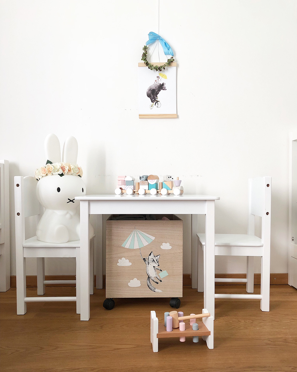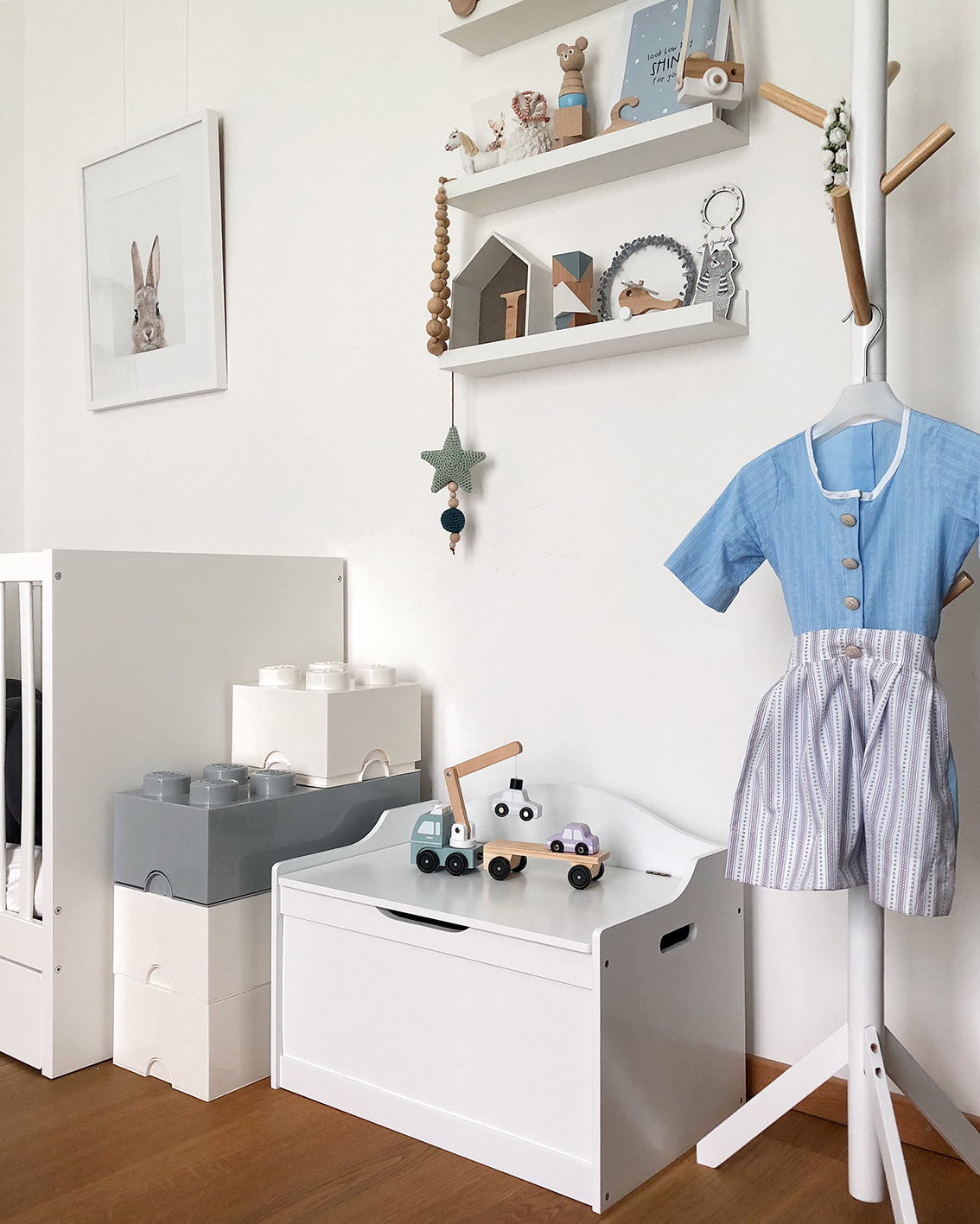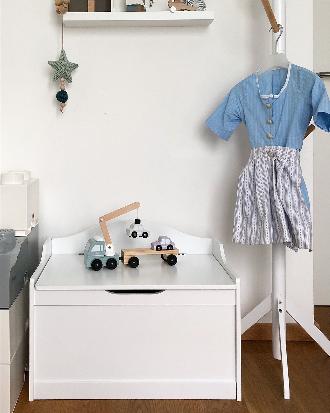 Instead of the smaller table with only 1 chair we have now a slightly bigger one and 2 matching chairs from Woodlii after the kids room make over. One for each child. As all the furniture is white we chose white here again. Next to the crib we threw that old wooden box away and we got a new one which can also be used as a bench to sit on. To hang all the jackets, coats and clothes we did put a clothes tree next to it. We love it already since day 1. Finally something to put out the clothes for the next day and no longer looking for them in the morning. Both is from Alice & Fox. And now with Oktoberfest time coming I can just hang the Dirndl here as a decoration. I would say really mom blog style.
