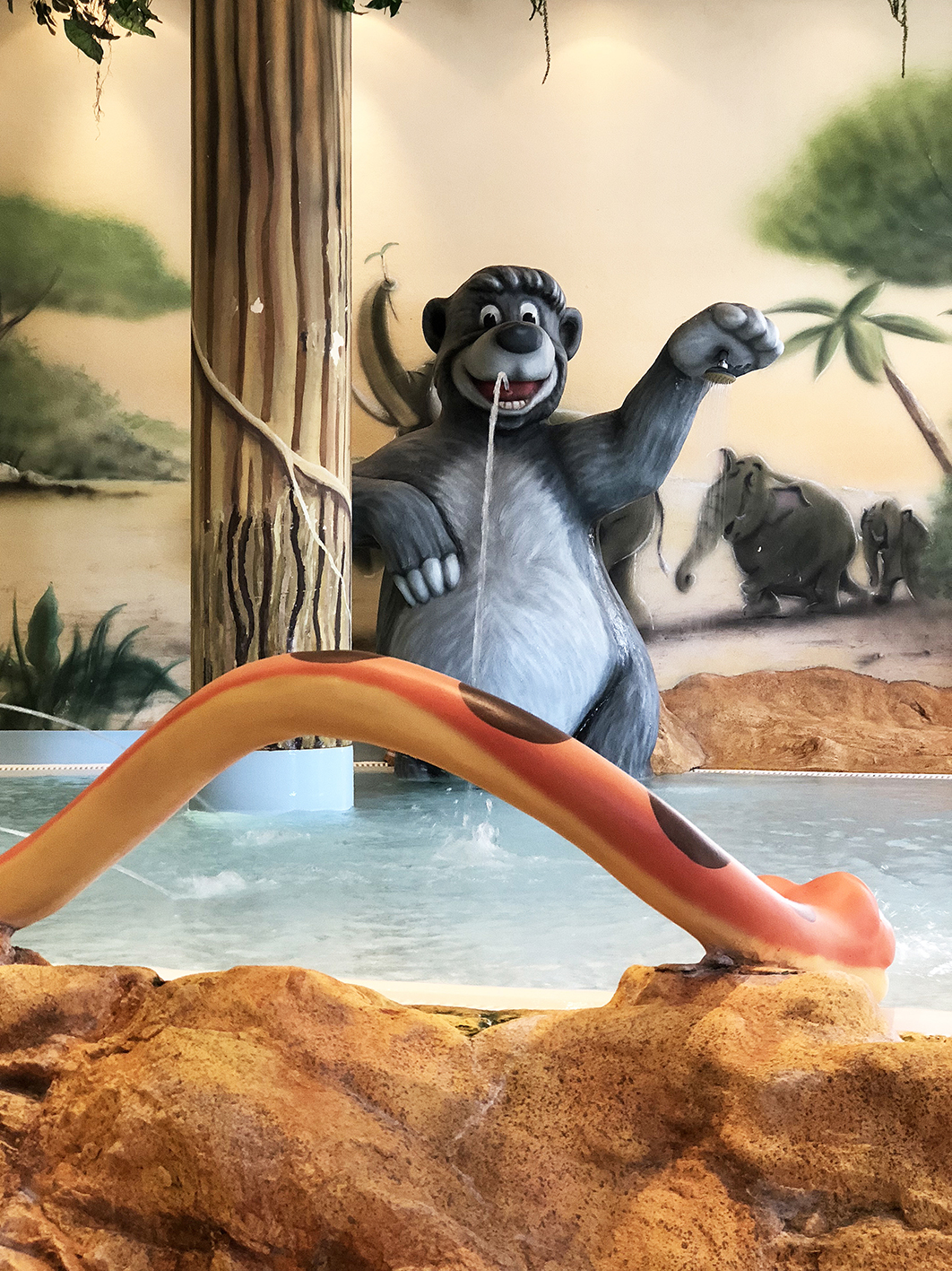 The Post Familyresort has a lot to offer for children. Outdoors and indoors is a lot to do and discover. Outside they do have a big playground fitting every age. The lake to swim in has a separate part for babies and small kids. There is a petting zoo, a trampoline, a carousel and a car pool with trikes, bobby cars and bicycles. If you want to you can play tennis or take riding lessons. Indoors you can find a baby pool next to the normal pools. I liked that a lot as it was really lovely done with the Disney characters of The Jungle Book. There is even a box with toys and floaties to borrow. In the cellar the children can play in the indoor playground and if you want to relax a bit without your kids simply bring them to the child care, doesn´t matter if baby or teenager. They are all welcome. And if you are there in winter time your kids can even attend a skiing course just next to the hotel.
