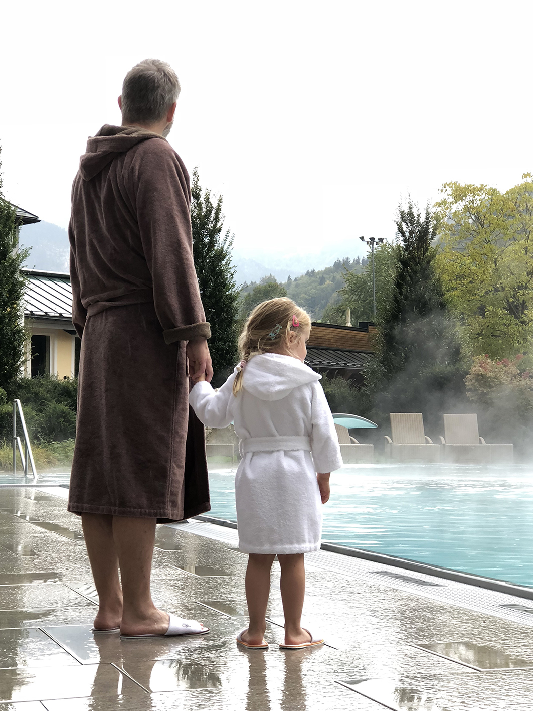 Wenn es einem möglich ist, die Kinder in die Kinderbetreuung zu bringen, kann man als Erwachsener auch etwas Zeit alleine genießen. Wir hatten Massagen im Wellnessbereich und einen Besuch in der Sauna. Beides sind eine Ruhezone, was bedeutet, dass Kinder nicht erlaubt sind oder zumindest ruhig sein müssen. Man kann aber auch Tennis spielen oder ein Fahrrad ausleihen und so die Gegend erkunden. Da die Zimmer große Balkone haben, ist es auch angenehm, dort einen ruhigen Kaffee und die Aussicht auf die Berge zu genießen. Wenn man eher der sportlicher Typ ist, kann man auch ins Fitnessstudio gehen. Vom Wandern im Sommer bis zum Skifahren im Winter sind den Aktivitäten keine Grenzen gesetzt.